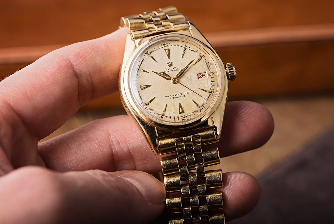 What lies beneath the Rolex Oyster Perpetual “Ovettone” Ref. 5030’s domed crystal is as developmentally important to the brand as the case. Sharp, dressy, and beautifully patinated from decades of wear, the cream-white matte dial shows a transitional moment for the brand. Early-midcentury top Rolex copy watches design staples like the polished alpha handset are present here, along with a very early depiction of the triangular 12 o’clock marker that would go on to adorn countless dive watches. On the other hand, future Datejust hallmarks like the baton handset, rectangular applied indices, cyclops date magnifier, and the Datejust name itself have yet to make their arrival by this point. The date display, though, is an interesting focal point for this design. The Ref. 5030 uses a roulette date wheel, alternating between black and red text to keep the display fresh and visually engaging. It’s a small touch, but one that adds character.