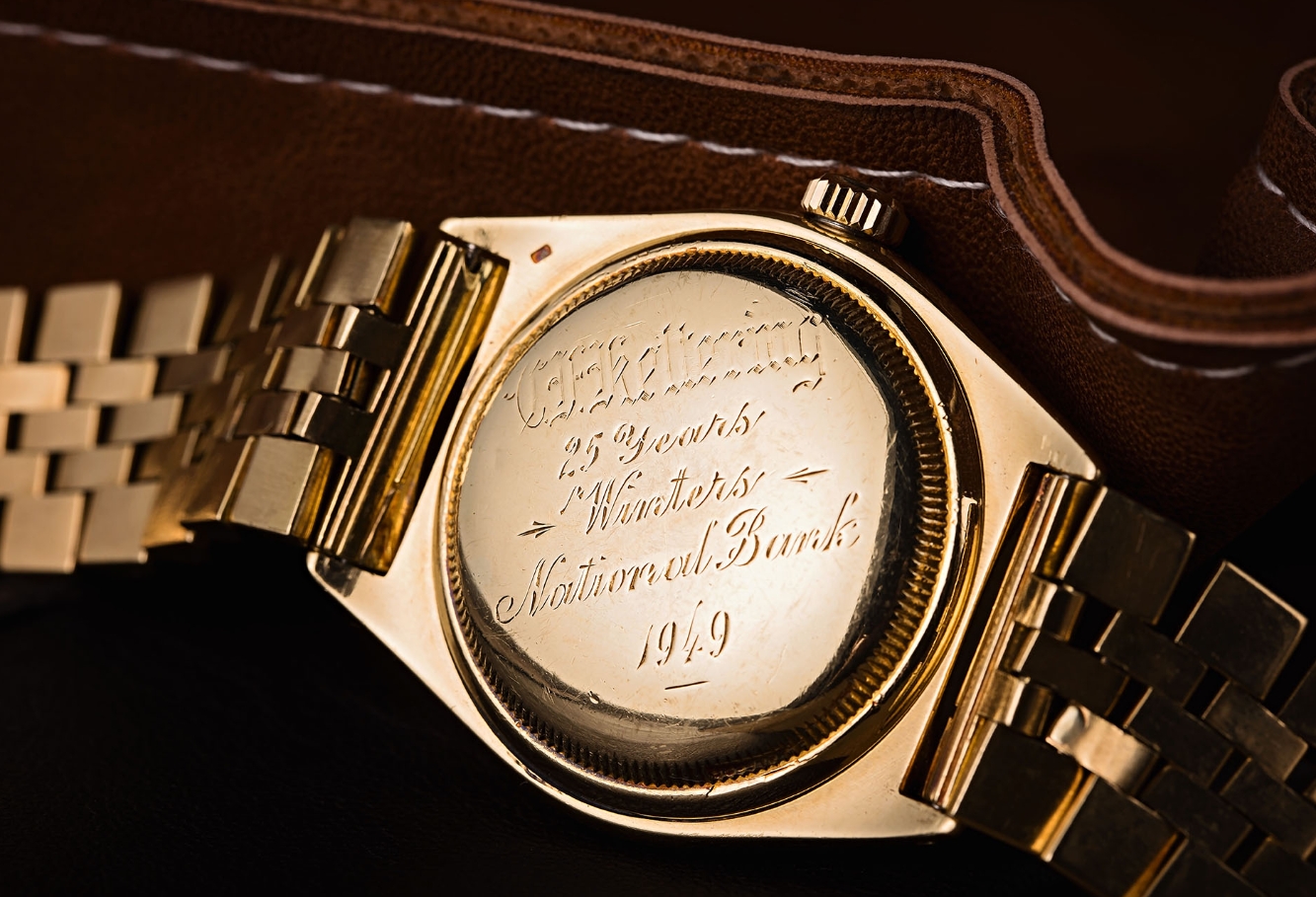 Even among “Ovettone” models, this particular Ref. 5030 has an impressive provenance. For those unfamiliar with the “Ovettone” family at large, these were a larger 36mm wide development of the classic “bubbleback” Oyster case design introduced in the mid-1940s. Named for the egg-like rounded side profile created by its deep caseback and tall domed crystal, the “Ovettone” has long been regarded as a pivotal milestone in the development of the Oyster case shape and remains a favorite among vintage connoisseurs to this day. This Ref. 5030 example, however, adds yet another layer of history to the mix. The 1:1 fake Rolex watches were originally purchased in 1949 by American engineer Charles F. Kettering, inventor of both the electric starter motor for automobiles and the aerial missile, as a gift for banker Walter H.J. Behm to commemorate 25 years of service with Winters National Bank. With a beautifully executed, carefully preserved caseback engraving to commemorate this, this Ref. 5030 is a true piece of history on multiple levels.